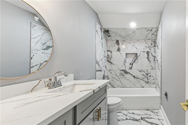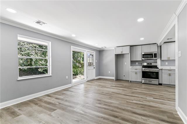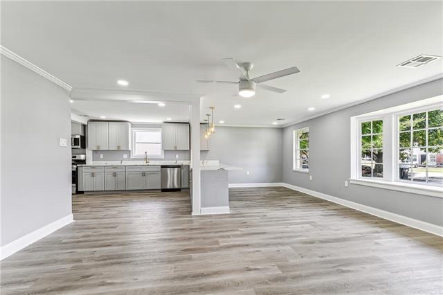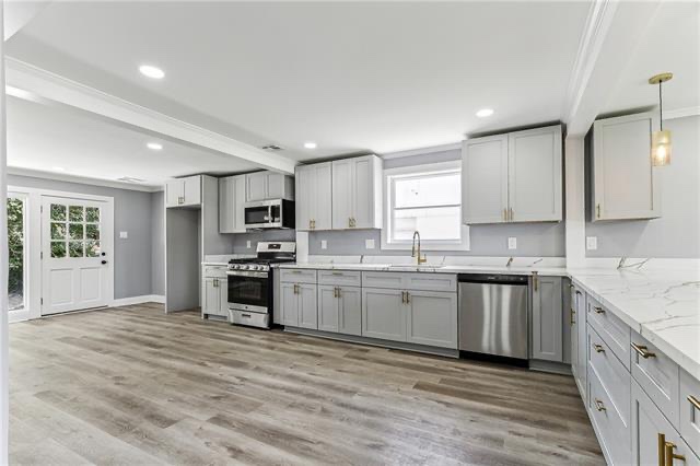 This home features 4 bedrooms, 2.5 baths, and 2,264 sq ft! A large kitchen with new cabinets, countertops, with gold finishes, and a separate dining room. The primary bedroom and one additional bedroom are located downstairs with a half bath for guest and your laundry room. Upstairs, you'll find two bedrooms and a full bath! This whole home has been renovated from top to bottom beautifully! Outside you will enjoy a large backyard and a fenced in yard! Located in a X flood Zone, with a newer roof, and move in ready!